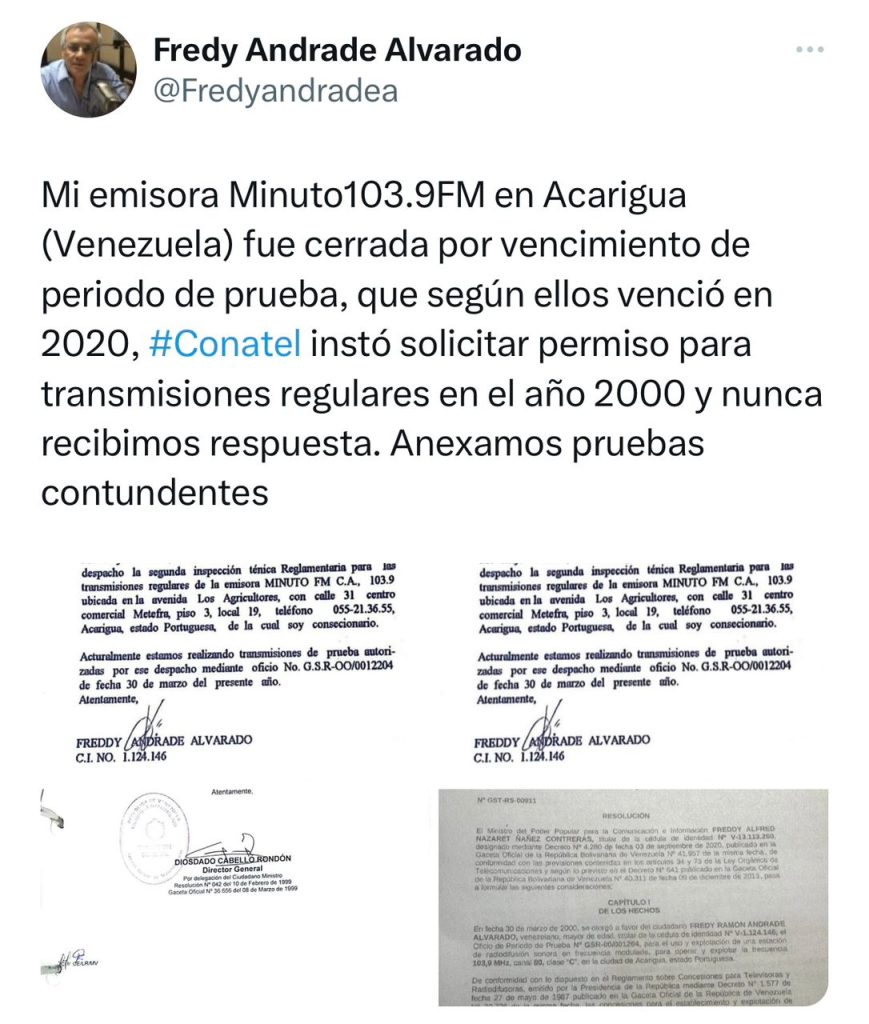 A través de X, detalló que fue cerrada por vencimiento de periodo de prueba, «que según ellos venció en 2020». Andrade dijo que Conatel instó a solicitar permiso para transmisiones regulares en el año 2000, pero nunca recibieron respuesta.