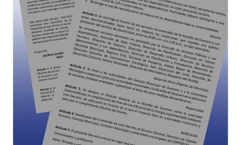 Como parte del plan “USO EFICIENTE DE LA ENERGÍA” que han dispuesto las autoridades nacionales, con el fin de normalizar los bloques de administración de cargas, debido a las altas temperaturas que afronta el territorio nacional, afectando el servicio eléctrico y generando una demanda inusitada de energía eléctrica; el alcalde de Guanare, Oscar Novoa, mediante el Decreto No. 09-2024 ha dispuesto un horario reducido y temporal de operaciones en los servicios no esenciales de la Alcaldía de Guanare a partir de este lunes 20 de mayo de 2024.