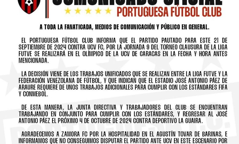 A través de las redes sociales, la directiva del Portuguesa FC informó que el partido pautado para este sábado 21 de septiembre, correspondiente a la jornada 9 del Torneo Clausura de la Liga FutVe se efectuará en el estadio Olímpico de la UCV en Caracas.