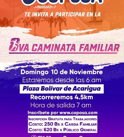 La 8va. edición de la Caminata Familiar de Coposa: 4.5K, se realizará el próximo domingo, 10 de noviembre, dando la oportunidad a sus trabajadores y toda la comunidad portugueseña a participar en este encuentro deportivo, que ya es tradición en la localidad.