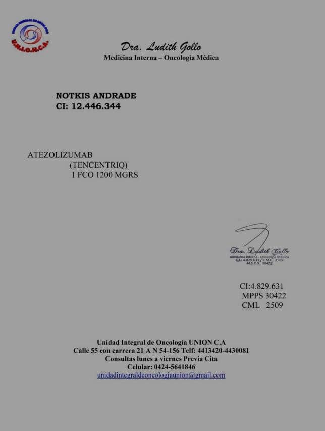 Para ayudar a Norkis con los elevados costos del medicamento ATEZOLIZUMAB (TENCENTRIQ), 1 FCO 1200 MGRS, que requiere con urgencia para su tratamiento, pueden hacer donaciones a través del Banco Banesco, cédula de identidad 12446344, teléfono 04245781990; y de ésta manera fortalecer la asistencia que requiere la joven dama portugueseña.