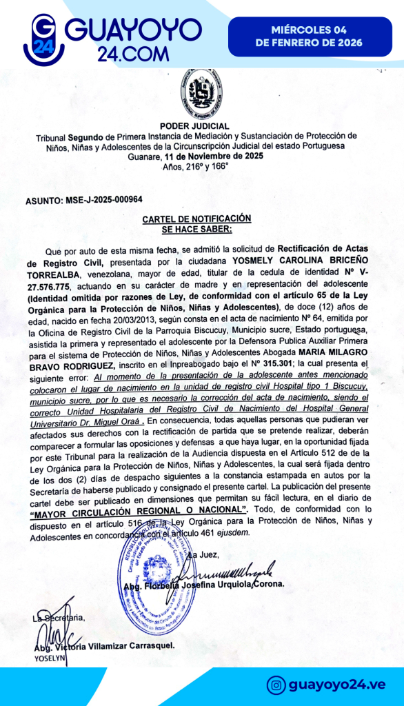 CARTEL DE NOTIFICACIÓN – RECTIFICACIÓN DE ACTA DE NACIMIENTO YOSMELY CAROLINA BRICEÑO TORREALBA