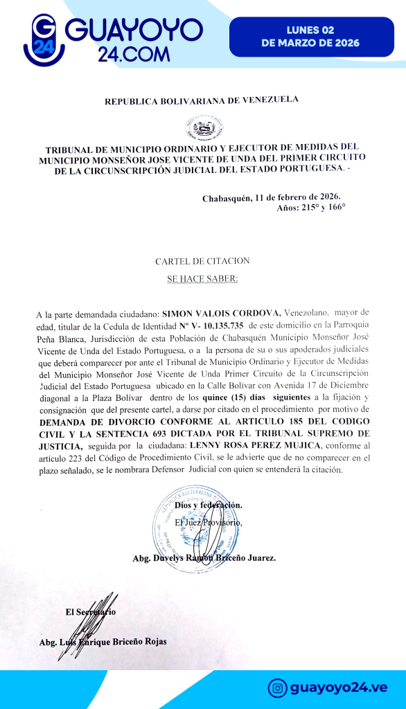 Inicio/PUBLICACIONES/CARTEL DE CITACIÓN: SIMÓN VALOIS CORDOVA C.I Nº V-10.135.735 PUBLICACIONES CARTEL DE CITACIÓN: SIMÓN VALOIS CORDOVA C.I Nº V-10.135.735 guayoyo Send an email 2 de marzo de 2026 Menos de un minuto Facebook Twitter WhatsApp Telegram Compartir por correo electrónico Imprimir guayoyo Send an email 2 de marzo de 2026 Menos de un minuto Facebook Twitter WhatsApp Telegram Compartir por correo electrónico Imprimir Compartir Facebook Twitter WhatsApp Telegram Compartir por correo electrónico Imprimir