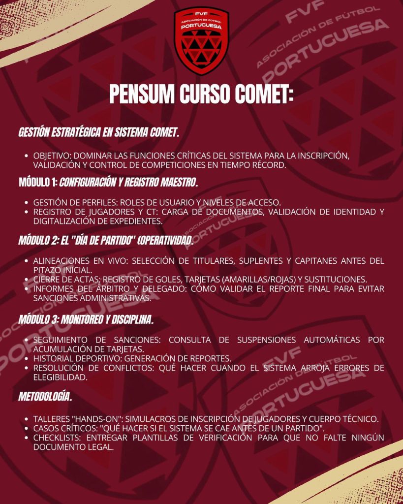 Como se sabe, la plataforma COMET, es la más usada mundialmente y sostiene estadísticas certificadas, reales y valorables para los datos de cada pasaporte deportivo, incluso para árbitros y entrenadores, con lo cual, ante esta gran necesidad, por los años de acefalia, la Asociación de Fútbol del estado Portuguesa (AFEP) sale al ruedo con este curso de primer nivel, que permitirá vincular a los gerentes de los distintos equipos del estado, más ahora que la FVF establece que los operadores de la referida plataforma no podrán ser entrenadores y menos dueños de equipo, dando un salto grande hacia la profesionalización del área.